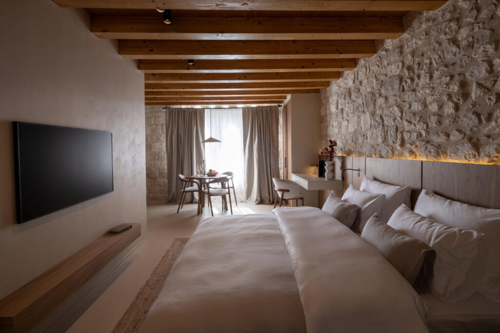 Das Apartment überzeugt durch ein harmonisches Designkonzept mit natürlichen Materialien und warmen Farbtönen. Hochwertige Mikrozementböden, dezente Beleuchtung und fein abgestimmte Details schaffen eine ruhige, luxuriöse Atmosphäre – ideal zum Entspannen nach einem Tag am Meer oder in der Altstadt.