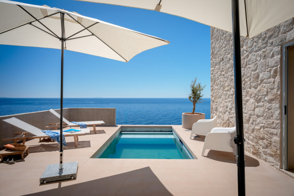 Die exklusive Villa Atropos auf der Insel Hvar liegt nur 500 Meter vom Strand Križna Luka entfernt und bietet ein stilvolles Urlaubserlebnis in unmittelbarer Meeresnähe.